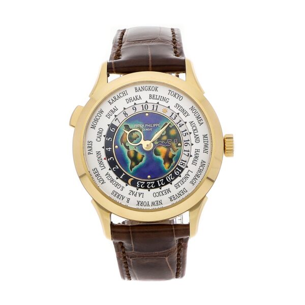 Pre-Owned Patek Philippe Complications World Time (5231J001) self-winding automatic watch, features a 38.5mm 18k yellow gold case surrounding a silver cloisonne enamel dial on a brown alligator strap with an 18k yellow gold Calatrava Cross deployant buckle. Functions include hours, minutes and world time. This watch comes complete with box and papers. We back this watch with a 2-Year Watchbox warranty!